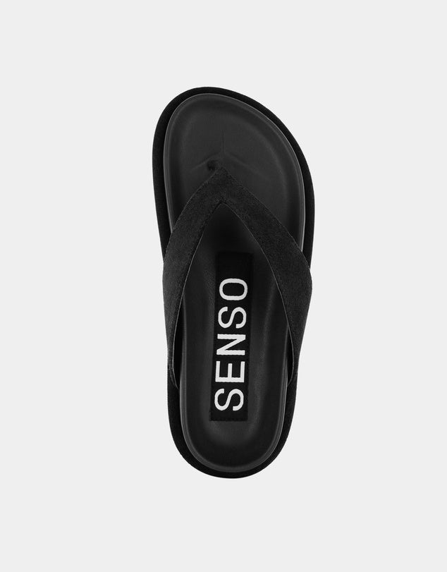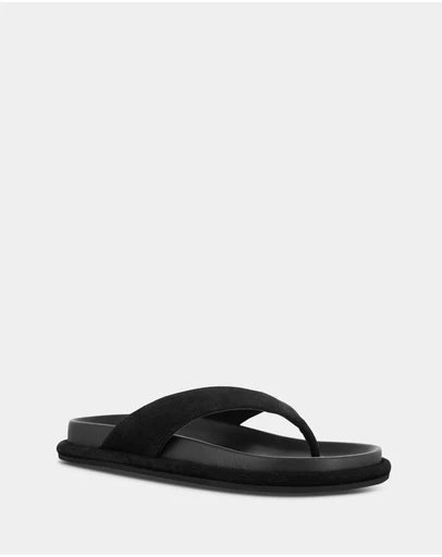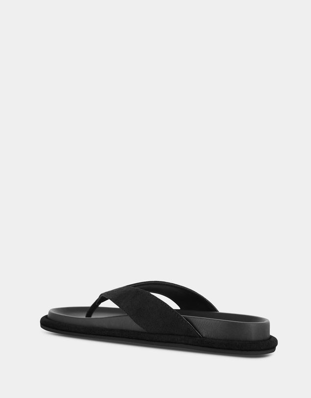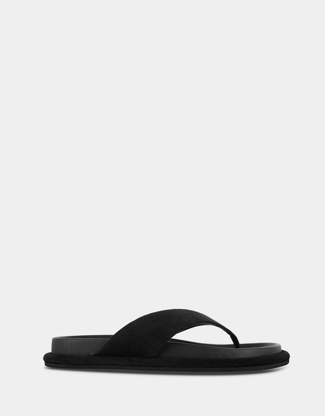 Ebony suede calf sandals featuring a rubber sole and a thong strap detail