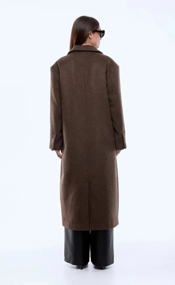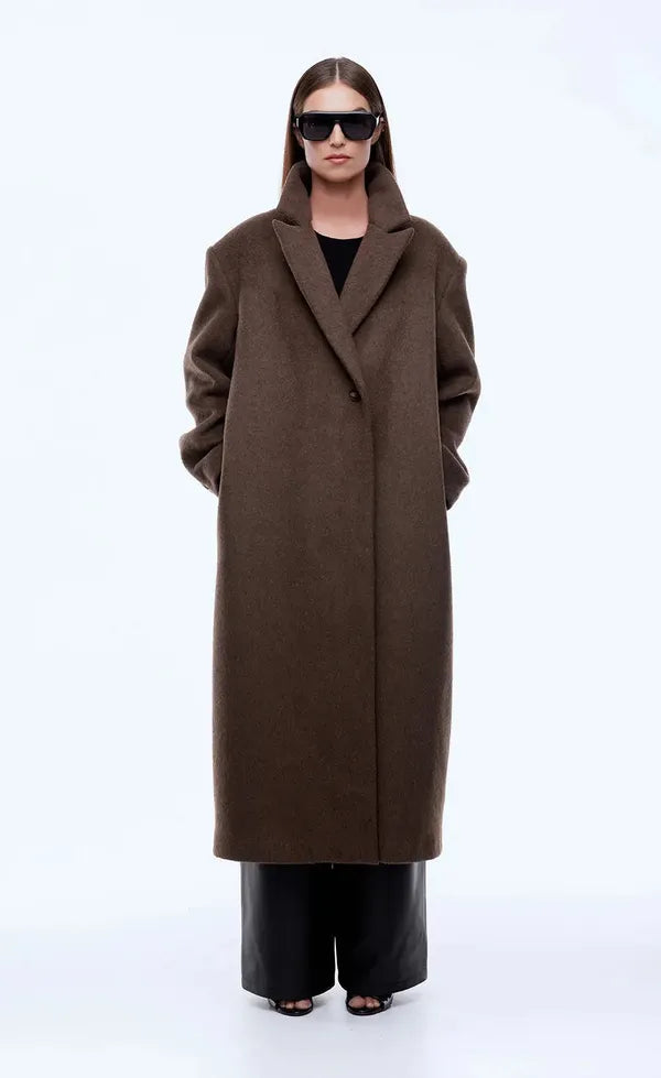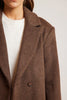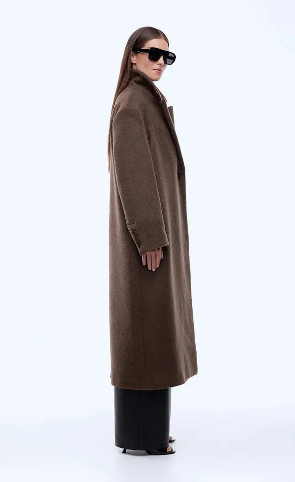 The Scarlet Coat is tailored from a wool-blend fabrication with a relaxed silhouette in espresso. Designed with a single-button front, clean lines and a centre back kick pleat, it's an elevated essential for refined cold-weather layering.
