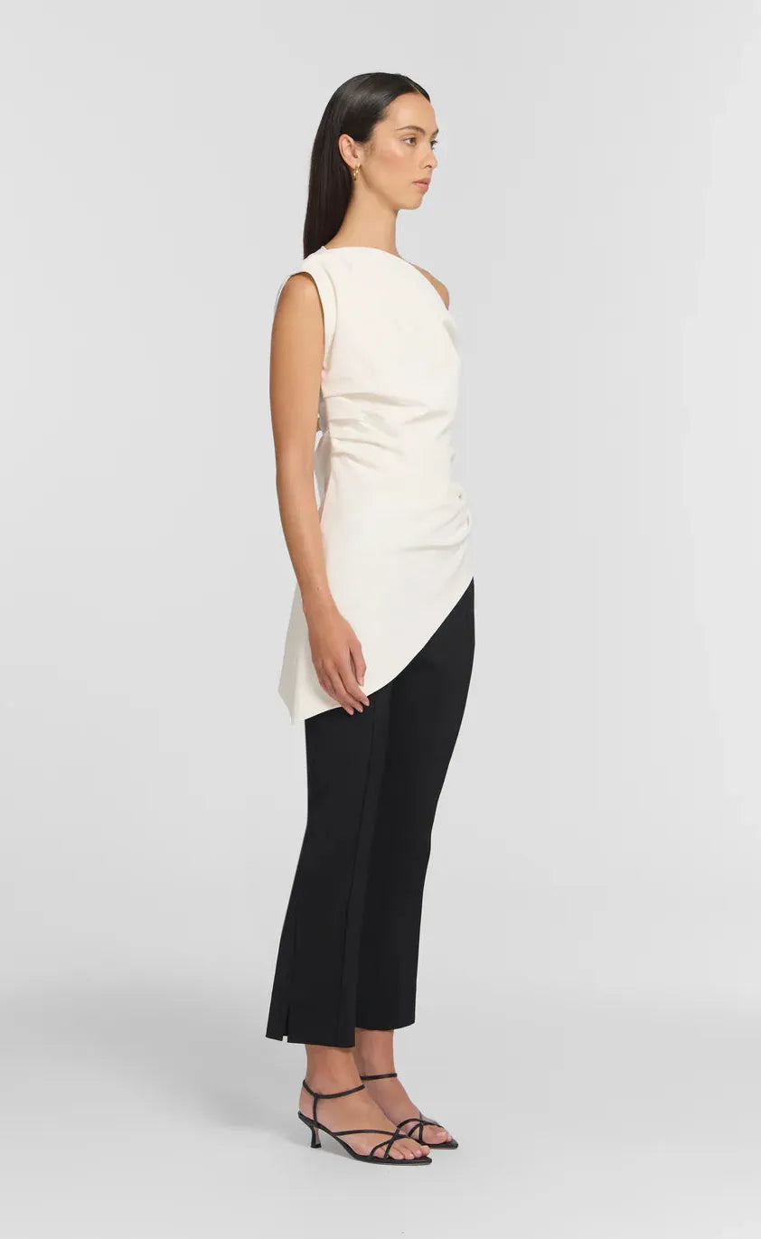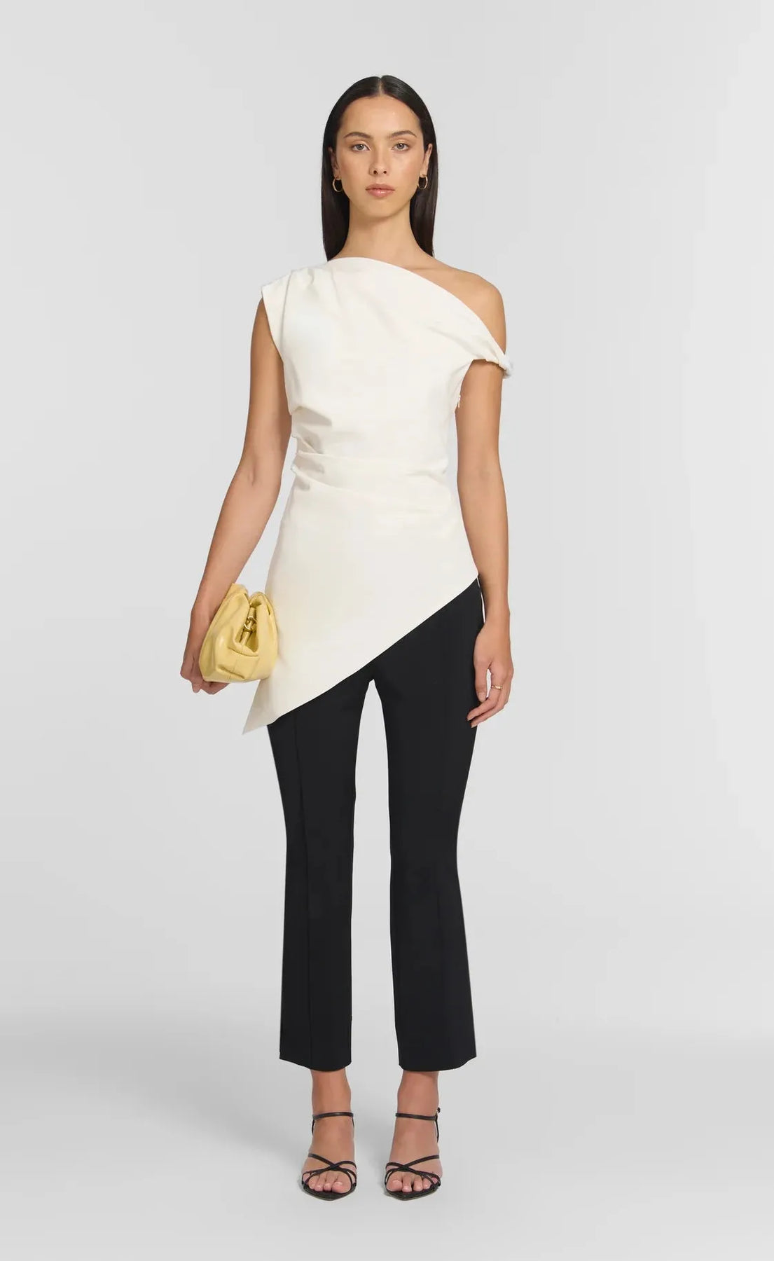 An architectural statement, the Valkyrie Tunic is crafted in classic ivory, showcasing a structured, asymmetric silhouette. Featuring twist detailing through the shoulders and an extended shoulder on one side, it showcases considered, flattering details.