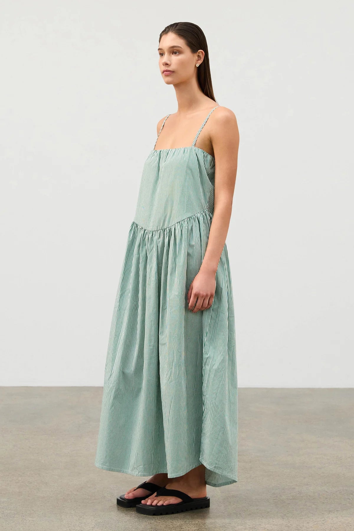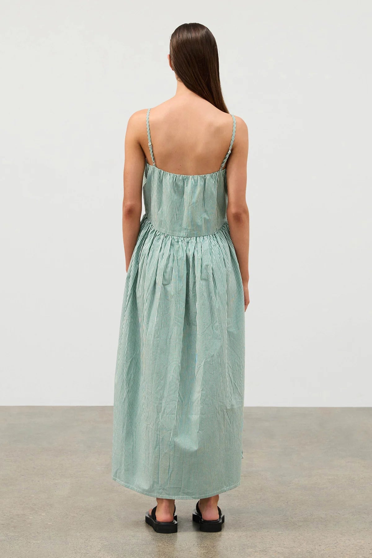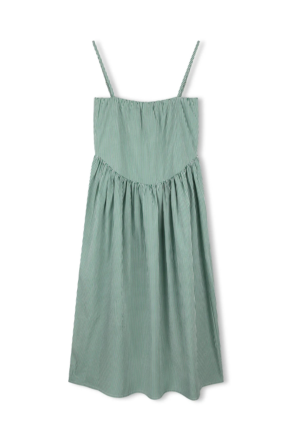 The Tallow Pin Stripe Cotton Dress boasts a straight neckline, complemented by fixed gathers and adjustable straps. Its curved drop waist creates a flattering silhouette, while the voluminous skirt with fixed gathers adds a detailed touch.