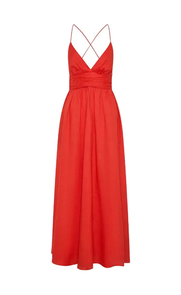 The Nala Strappy Maxi Dress in red features a V-neckline, thin straps and a lace-up back for adjustable shape. A gathered waistband defines the silhouette, falling into a full-length maxi skirt that moves with ease. Designed for warm, sun-filled days and effortless occasions. Style with sandals for daytime celebrations or elevate with heels for evening events and summer nights out.