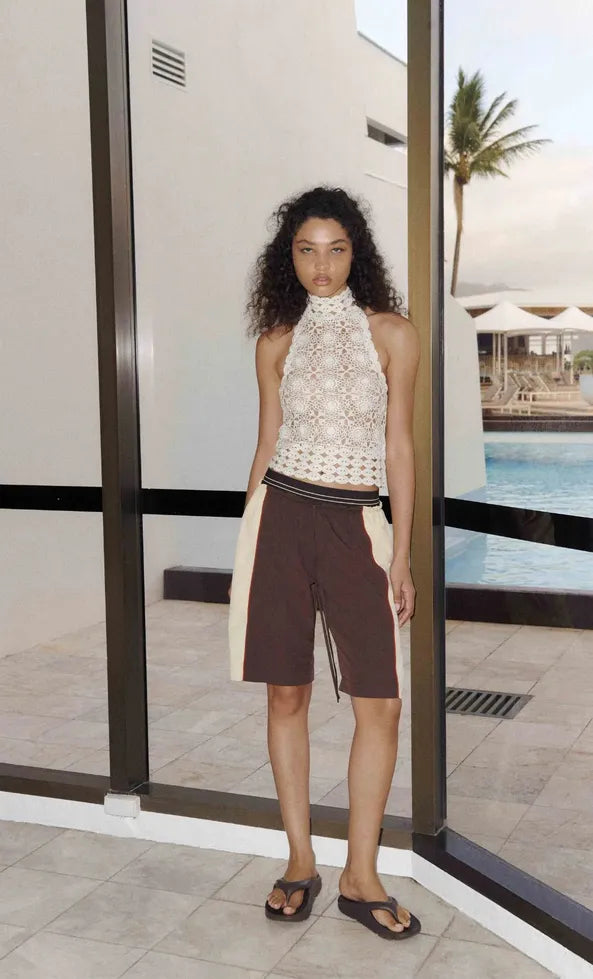 Jerri Long Short in Chocolate/Buttercream. These relaxed striped long shorts are chic and comfortable, becoming the perfect summer staple to elevate your wardrobe.