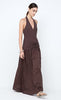 Sabrine Halter Maxi Dress in Dark Chocolate. This elegant brown halter maxi dress combines a modern ribbed bodice with a flowing cotton voile skirt, creating a sophisticated look for holiday escapes.