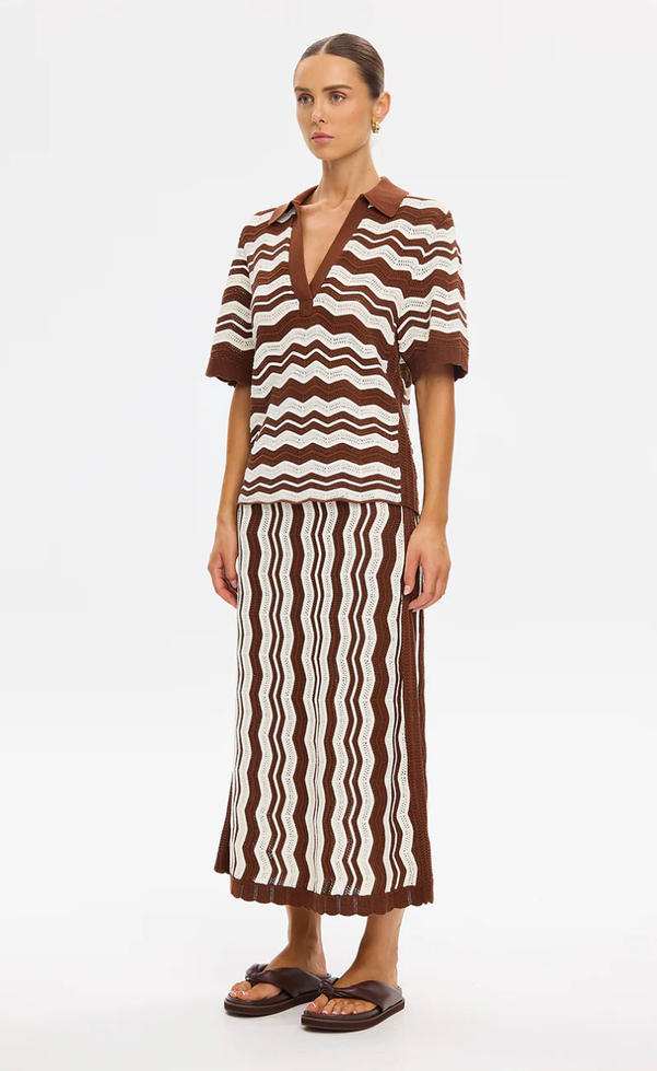 The Sarah Knit Top is a relaxed silhouette defined by a delicate pointelle wave stripe stitch and finished with a soft knitted collar. Light in feel yet considered in detail, it’s designed for everyday ease. Wear with denim or tailored shorts for coastal weekends, or pair back with the Sarah Knit Midi Skirt for long lunches and warm-weather gatherings.