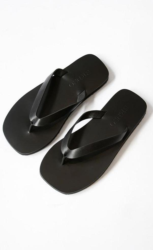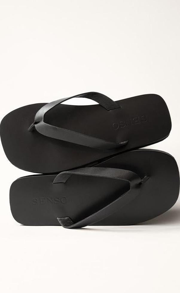 Ebony Calf Leather sandals featuring a light rubber sole and a thong strap detail.