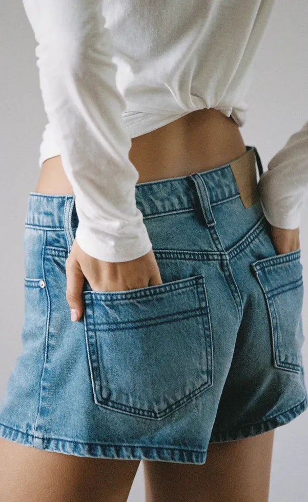 Our new high rise, relaxed short, created in collaboration with Olive Cooke. Sitting just below the true waist with a flattering A-line shape through the hips and thigh. Crafted in a premium rigid denim.