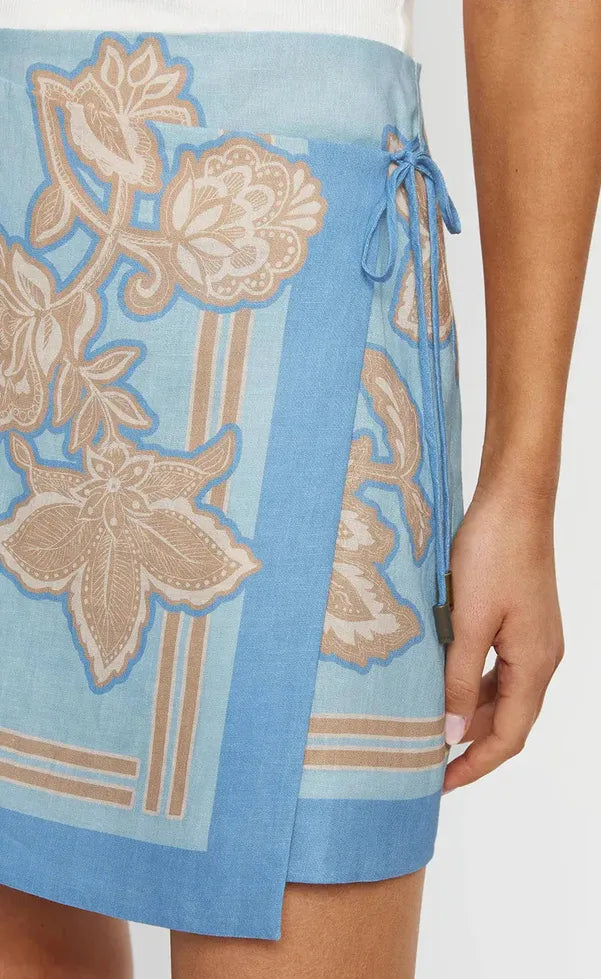 Coco is a soft botanical print featuring blush-toned florals set against a light blue base. The Coco Mini Skirt features a wrap-front silhouette with contrast ties and a bordered hem, offering a clean, modern finish. Designed for ease and movement, it’s a versatile piece for warm-weather wardrobes. Style with the matching Coco Cropped Shirt for a coordinated look, or pair with a simple tank and sandals for relaxed weekend dressing
